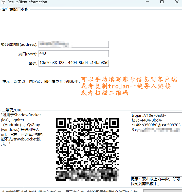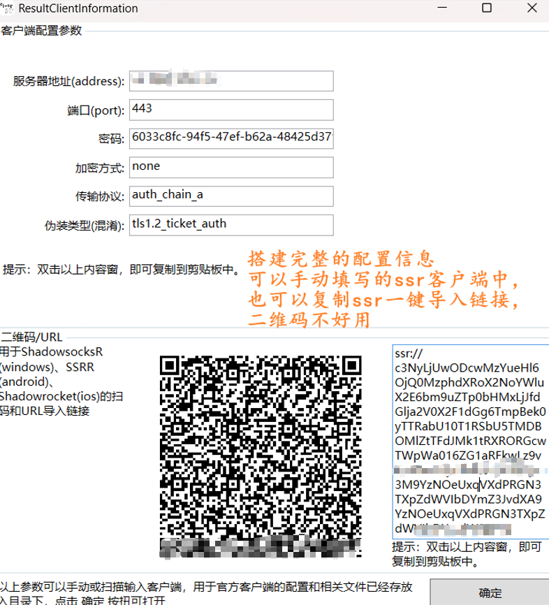 搭建完成后会弹出账号信息,可以手动填写到SSR客户端,也可以复制一键导入链接。