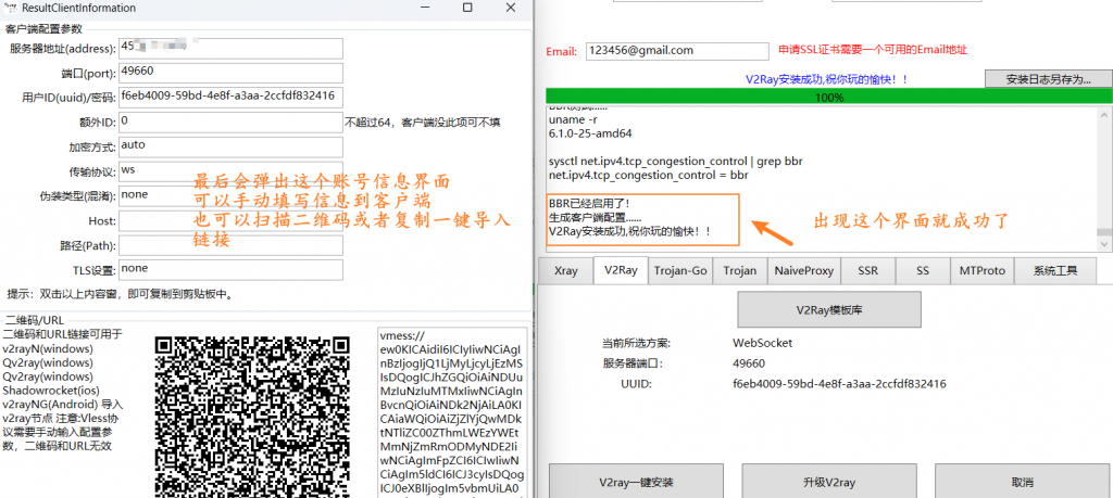 填上ip和密码,端口22和root默认。注意:ProxySU-v2.5.7版本,就算没有域名,在界面上也需要填写1个邮箱,可以是真实的,也可以随便填写1个,比如[email protected] 不然软件无法正常运行。