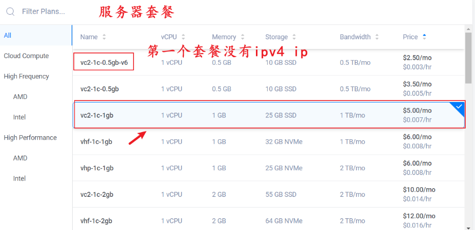 选择服务器套餐。有的服务器的最低价格会不同,一般纽约等位置的价格最低,有3.5美元/月的,可根据自己的需求来选择。推荐洛杉矶服务器,延迟较低且比较稳定。注意:2.5美元/月的套餐只提供ipv6,没有ipv4。
