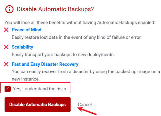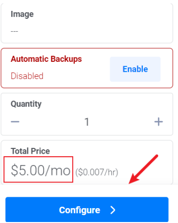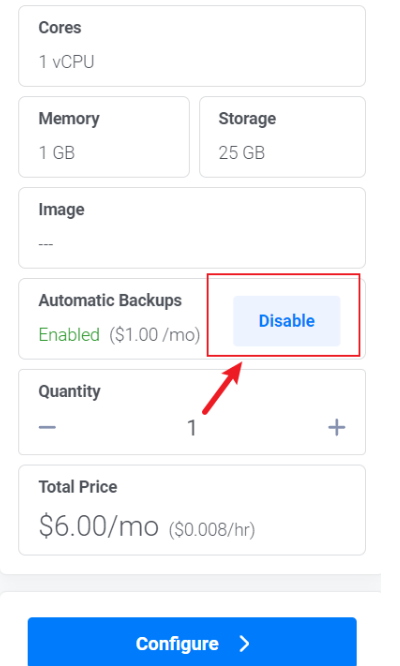 关闭自动备份Auto Backups,这个是收费的,每月1美元。点击它就可以省1美元,在右侧的I understand the risk前面选择勾,然后点击Disable Auto Backups即可关闭自动备份。接下来进行下一步,点击“Configure”