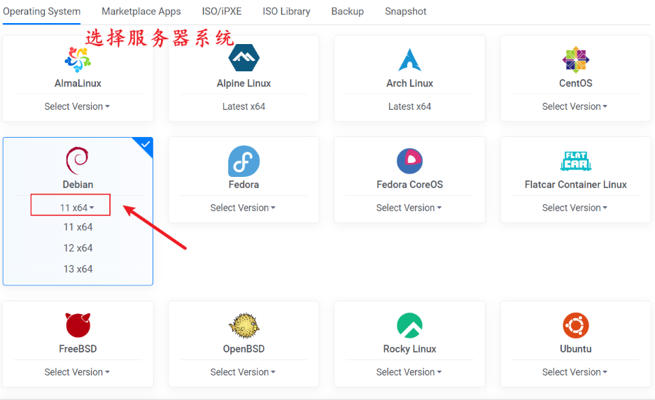 点击图中的系统名字,会弹出具体系统版本,推荐Debian 11