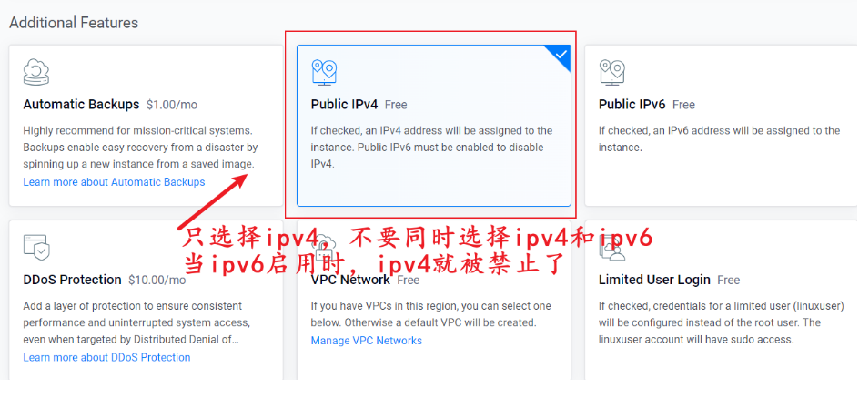 注意:2.5美元套餐只提供ipv6 ip,一般的电脑用不了,所以建议选择3.5美元及以上的套餐。