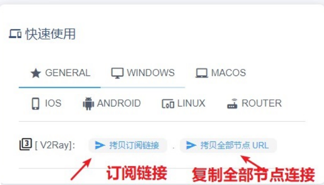 购买相应的套餐后,打开“用户中心”,在“快速使用”这里可以复制订阅链接以及所有节点信息,也可以在节点列表获取单个节点信息。