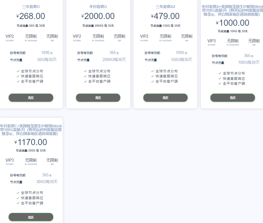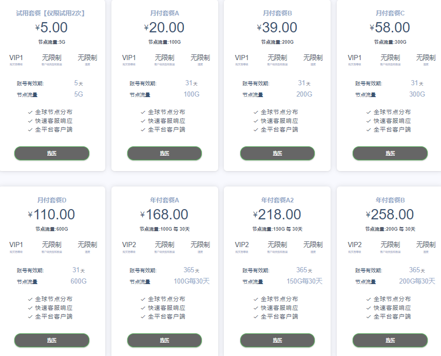试用套餐5元(5天)、月付套餐A 20元、月付套餐B 39元、月付套餐C 58元、年付套餐A 168元、年付套餐A2 218元等,套餐购买